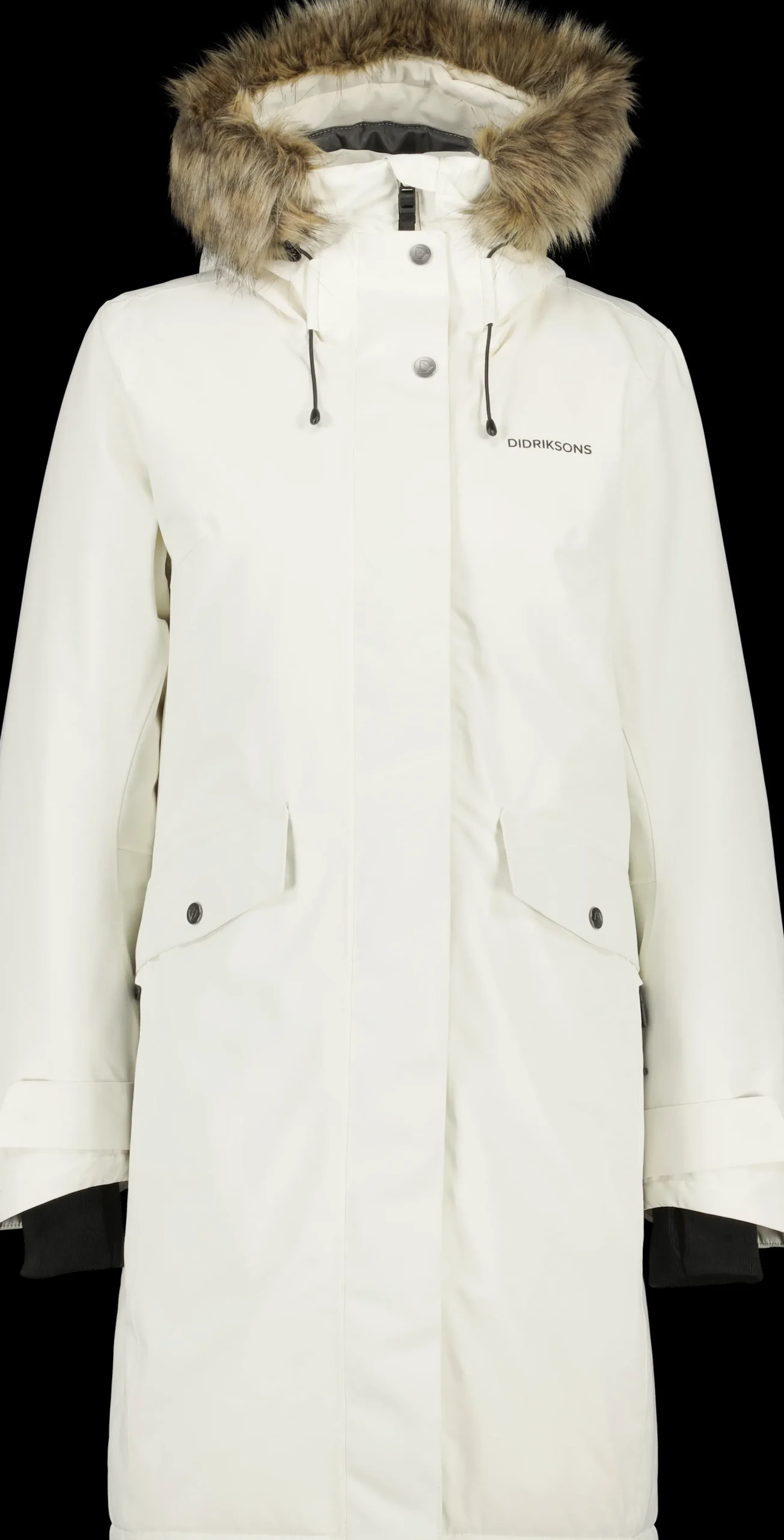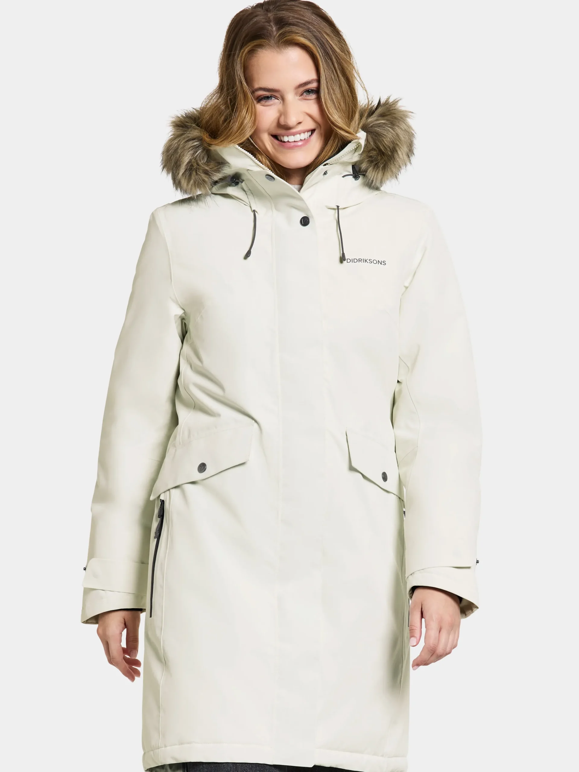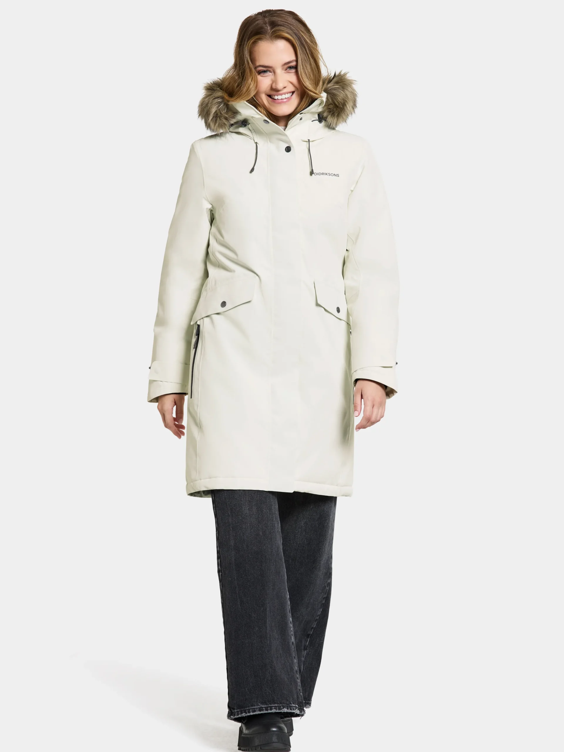 Laget Av Myk Polyester Med Matt Overflate. Erika Har Justerbar Hette Med Avtakbar Kant Av Fuskepels, Og Den Har Hoy Krage. Falden, Midjen Mansjettene Og Hetten Kan Justeres Etter Behov. Refleksdetaljer Som Inkluderer Didriksons’ Navn Og Logo, Band I Frontlommen Og Glidelasdragerne. Isolasjonen Er Laget Av 100% Resirkulerte Fibre, Og Foret Er Farget Med Solution Dye, Som Er En Innfargingsteknikk Som Sparer Opptil 80% Vann Sammenlignet Med Konvensjonell Farging Av Polyester/Polyamidstoff. For Fargevariantene Black, Dark Night Blue Og Deep Green Er Skallmaterialet Farget Med Solution Dye Ogsa. Pfc-Fri, Vannavstotende Finish.